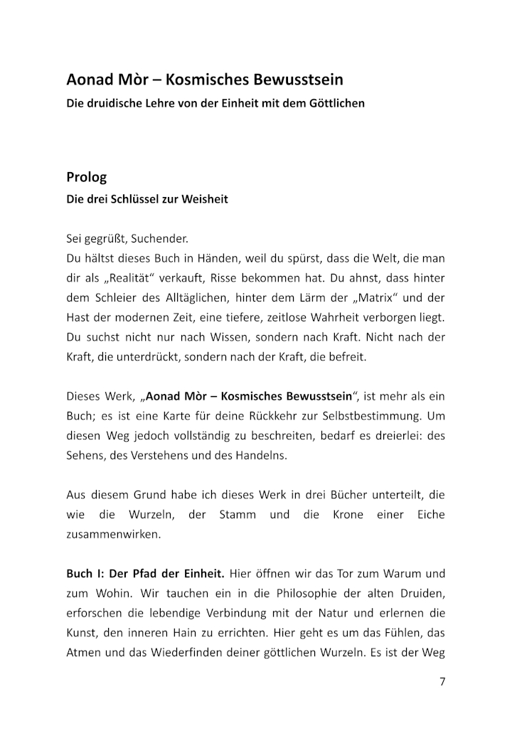 Nein, es sind absolut keine Vorkenntnisse nötig. „Aonad Mòr – Kosmisches Bewusstsein“ holt dich genau dort ab, wo du aktuell stehst. Das Buch richtet sich an alle Menschen, die spüren, dass hinter der Hektik unseres modernen Alltags (der „Matrix“) eine tiefere Wahrheit verborgen liegt. Es ist systematisch aufgebaut und führt dich Schritt für Schritt in die keltische Lebensphilosophie ein. Somit ist das Werk sowohl für spirituelle Neueinsteiger als auch für fortgeschrittene Suchende ein wertvolles und tiefgreifendes Handbuch auf dem Weg zur Selbsterkenntnis.