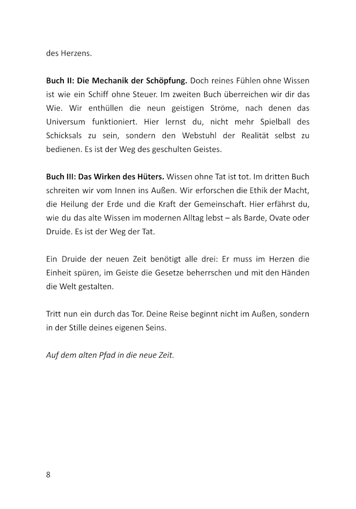 Buch III – Das Wirken des Hüters: Der abschließende Pfad zeigt dir, wie du deine erlangte Meisterschaft nach außen trägst, um als moderner Barde, Ovate oder Druide als wirkmächtiger Hüter der Erde in der neuen Zeit zu agieren.