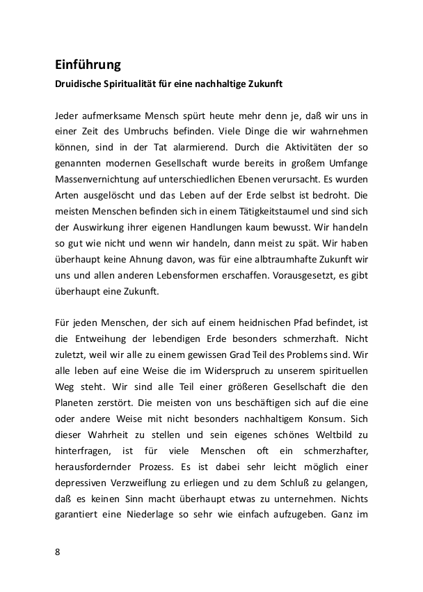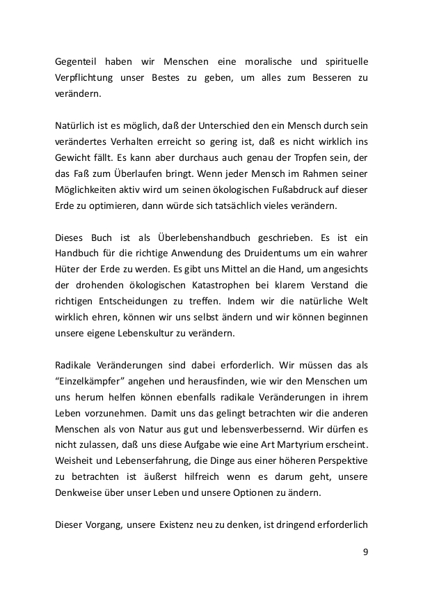 Das jetzt vorliegende Buch “Druidentum Heute – Druidische Spiritualität praktisch gelebt” ist als Überlebenshandbuch geschrieben. Es ist ein Handbuch für die richtige Anwendung des Druidentums um ein wahrer Hüter der Erde zu werden. Es gibt uns Mittel an die Hand, um angesichts der drohenden ökologischen Katastrophen bei klarem Verstand die richtigen Entscheidungen zu treffen. Indem wir die natürliche Welt wirklich ehren, können wir uns selbst ändern und wir können beginnen unsere eigene Lebenskultur zu verändern.