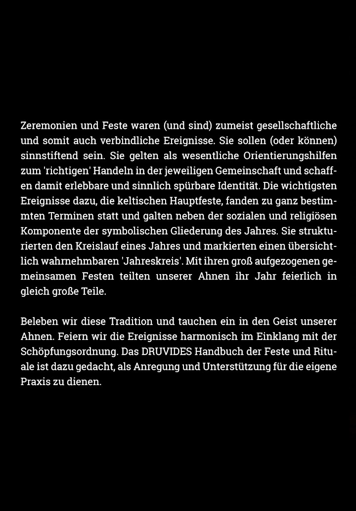 Beleben wir diese Tradition und tauchen ein in den Geist unserer Ahnen. Feiern wir die Ereignisse harmonisch im Einklang mit der Schöpfungsordnung. Das DRUVIDES Handbuch der Feste und Rituale ist dazu gedacht, als Anregung und Unterstützung für die eigene Praxis zu dienen.