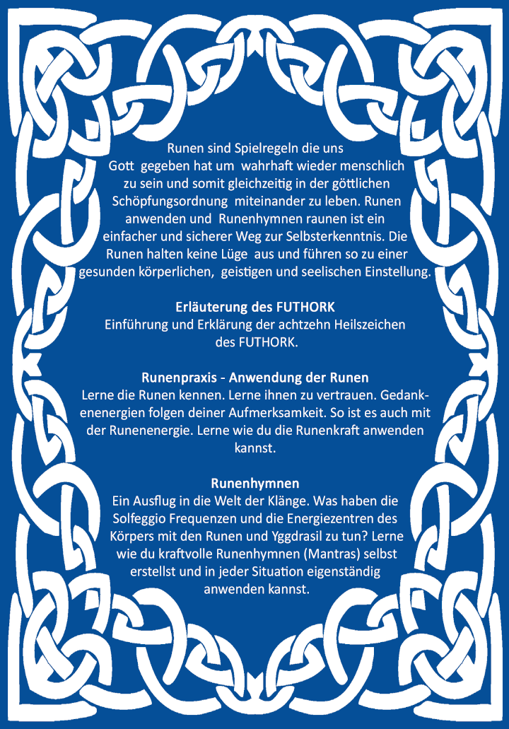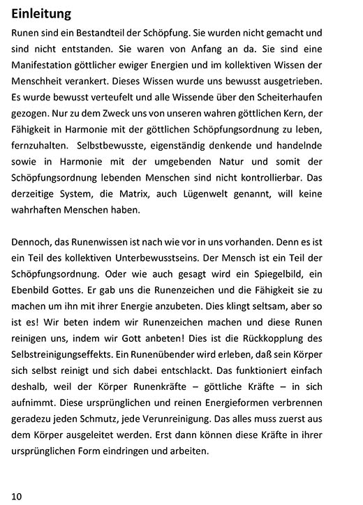 Runen sind Spielregeln die uns Gott gegeben hat um wahrhaft wieder menschlich zu sein und somit gleichzeitig in der göttlichen Schöpfungsordnung miteinander zu leben. Es gibt viele Pfade und Wege die jeder Mensch nutzen kann um sich selbst zu finden. Runen anwenden und Runenhymnen raunen ist ein einfacher und sicherer Weg zur Selbsterkenntnis. Die Runen halten keine Lüge aus und führen so zu einer gesunden körperlichen, geistigen und seelischen Einstellung. Nutze die Runenkraft und raune dein schöpferisches Potential.
